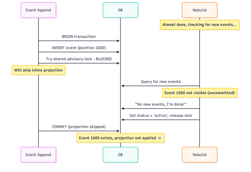 The rebuild process checks for new events, sees none (because event 1000 is still in an uncommitted transaction), declares victory, and sets the projection to active. Meanwhile, the append transaction has already decided to skip the inline projection. When it finally commits, the event exists but was never projected. The rebuild process is done, and only new events will update the projection during the next update to the new event append.