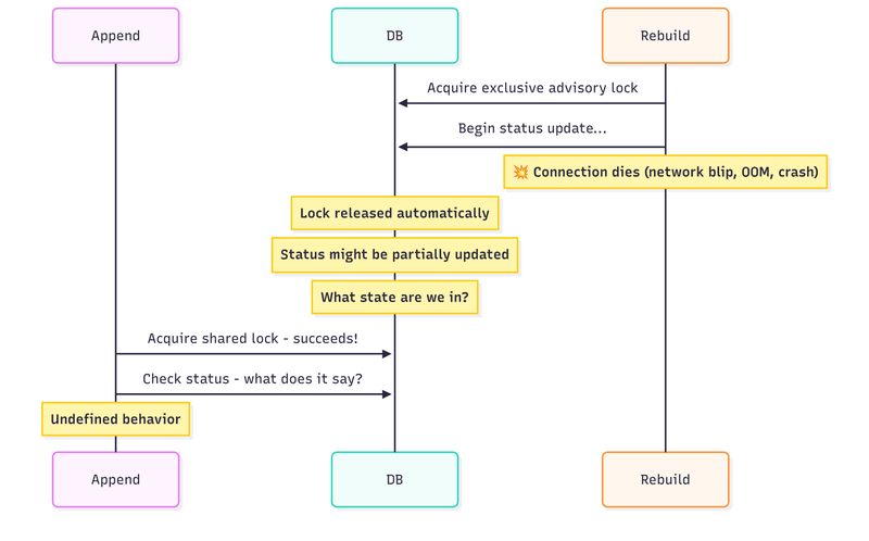 What if we use advisory locks more aggressively? The idea: when rebuild is ready to complete, acquire an exclusive lock that blocks the entire append path. While holding this lock, flip the status to ‘active’. No appends can be in progress during the flip, so no race condition, right?