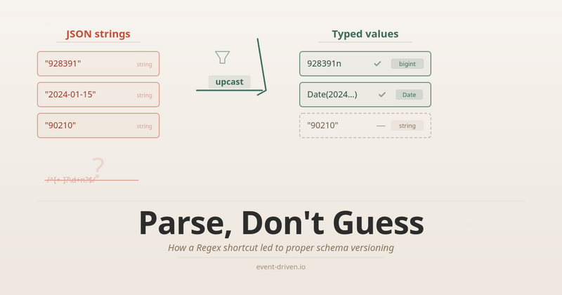 And here’s where things started to click for me. I added upcasting to fix the bigint problem: explicit type mapping instead of a Regex. But the same mechanism, without any changes, also handles structural versioning. The simple string → Date mapping from the first example is the same code path as the clientId → client migration above. It’s one function, one place, one pattern for all of it: type coercion, field restructuring, schema migration.