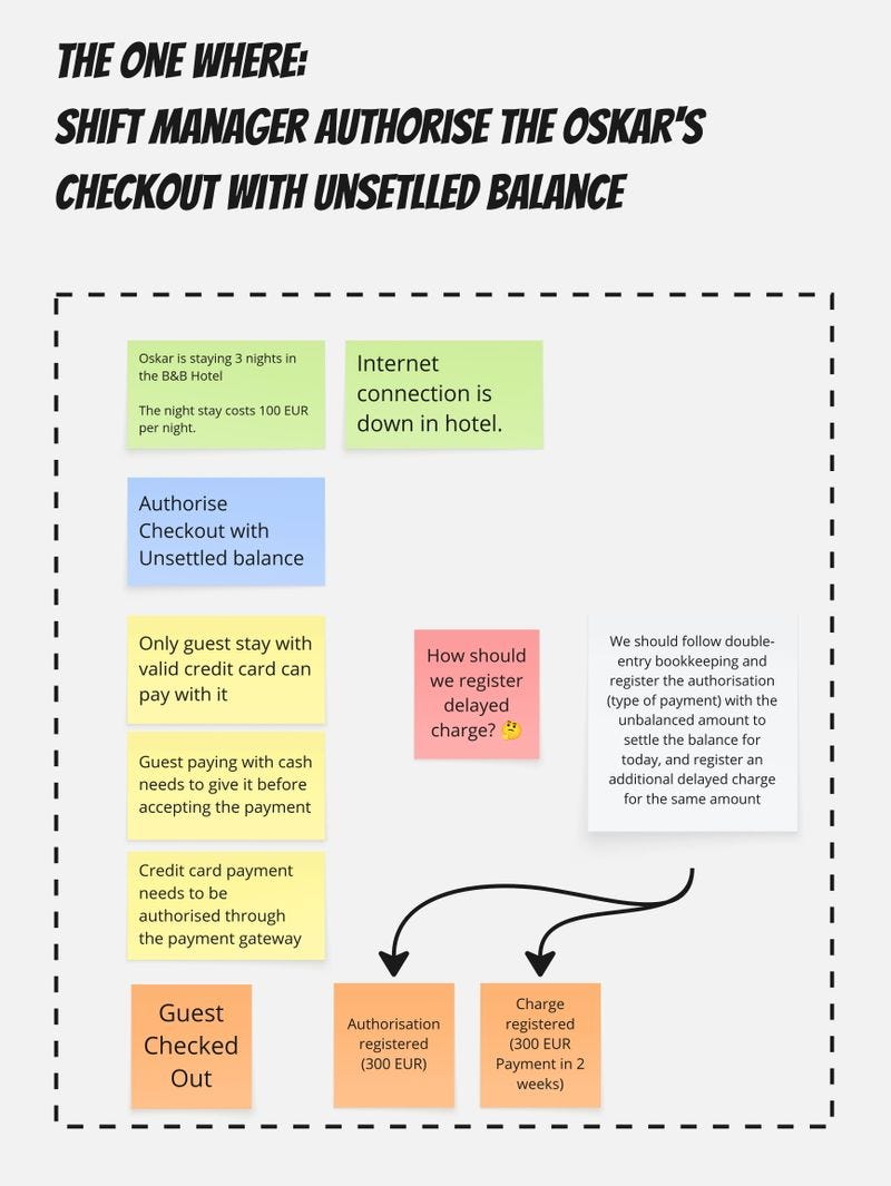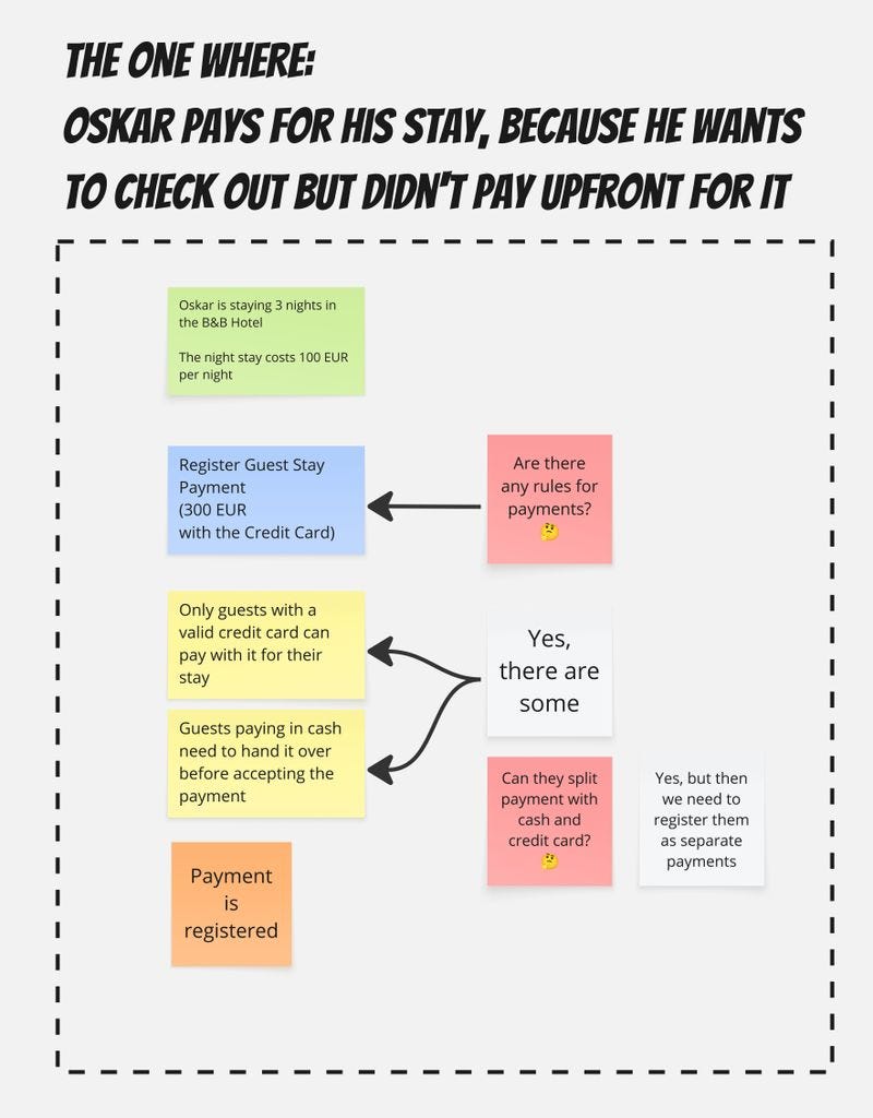 And hey, we just found out new business rules, let’s put them on the board and update our flow to be more precise and reflect our scenario by adding a note that this scenario represents a guest paying with a credit card.