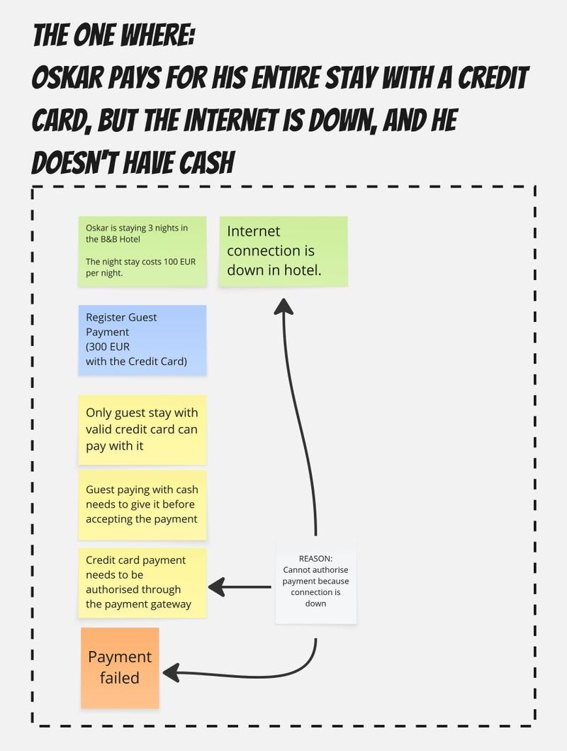 Here’s the updated flow. The one where Oskar pays for his entire stay with a credit card, but the Internet is down, and he doesn’t have cash.