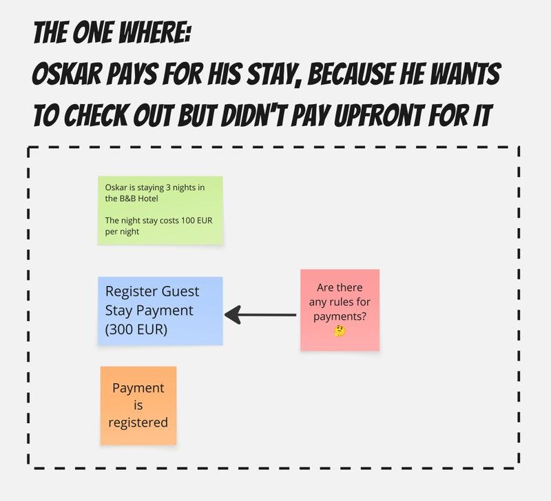 It’s the one Oskar pays for his stay, because he wants to check out but didn’t pay upfront. The payment is registered, and we can try checking out again. Sounds fine, but we should ask whether there are any rules for payments. It may appear that: