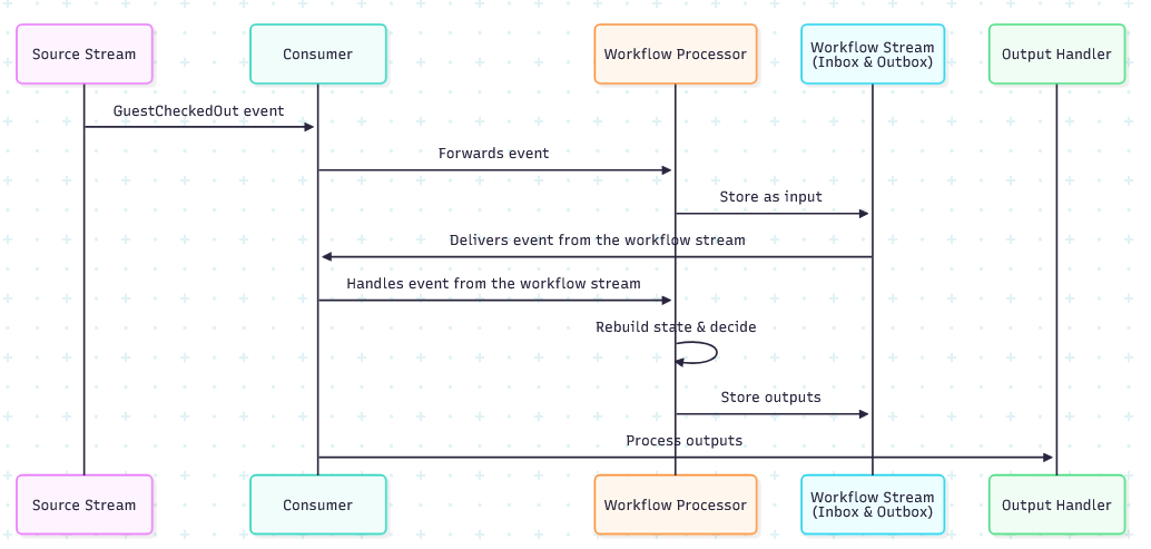 We're adding a workflow processing engine to Emmett for coordinating multi-step/asynchronous business processes. It uses an event store behind the scenes to provide durable execution with full observability, treating each workflow instance as an event stream that acts as both inbox and outbox for handled messages.