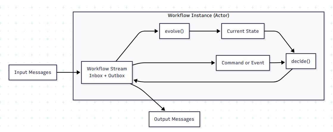 decide: Business logic that takes input + state and returns outputsevolve: Builds state based on events (both inputs and outputs)initialState: Starting state for new workflow instances